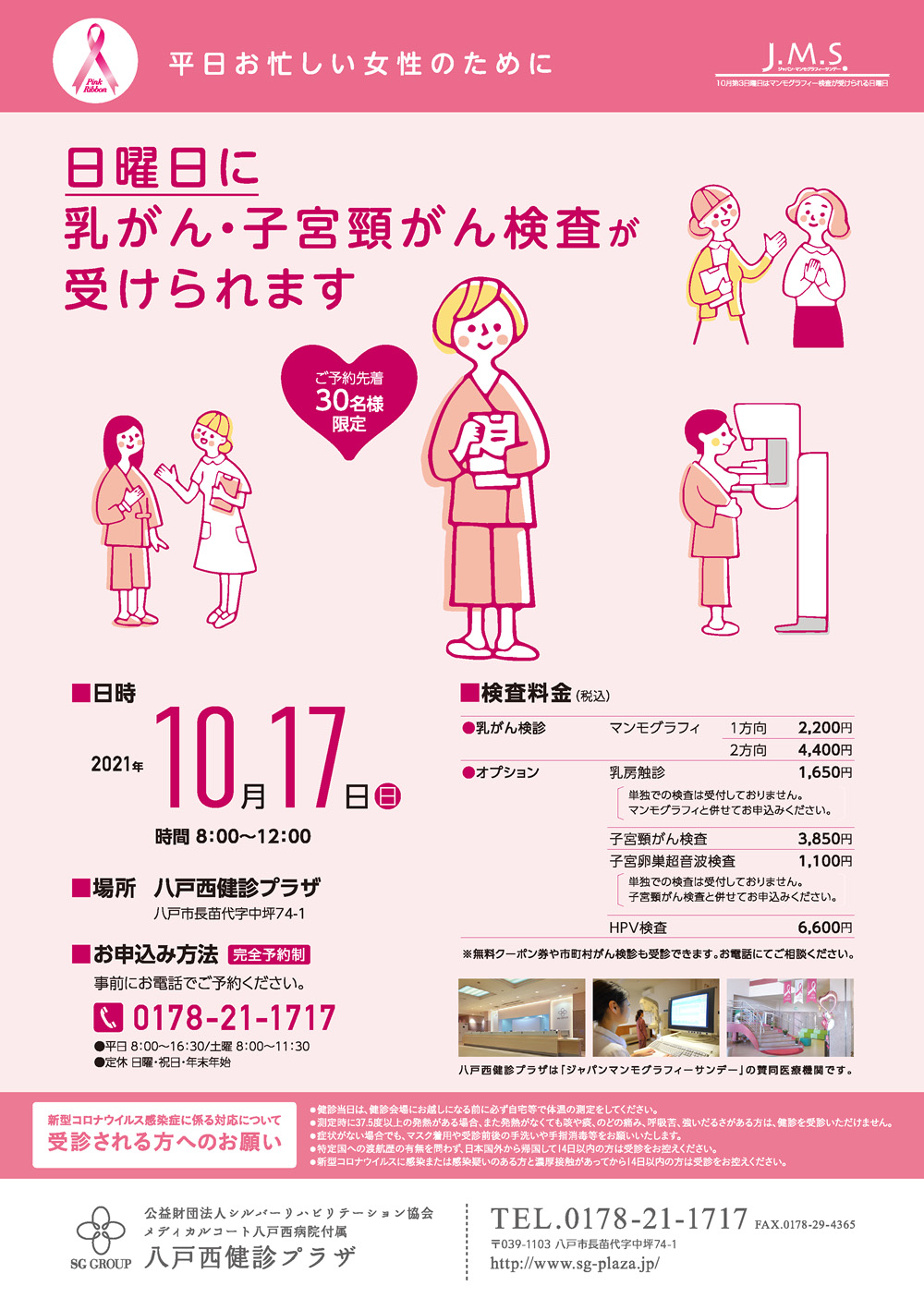 また、乳がんの正しい知識を広め乳がん検診の早期受診を勧めることを目的にピンクリボン運動に参加し、平日忙しい働く女性に向けて日曜日に乳がん検診を実施しております。